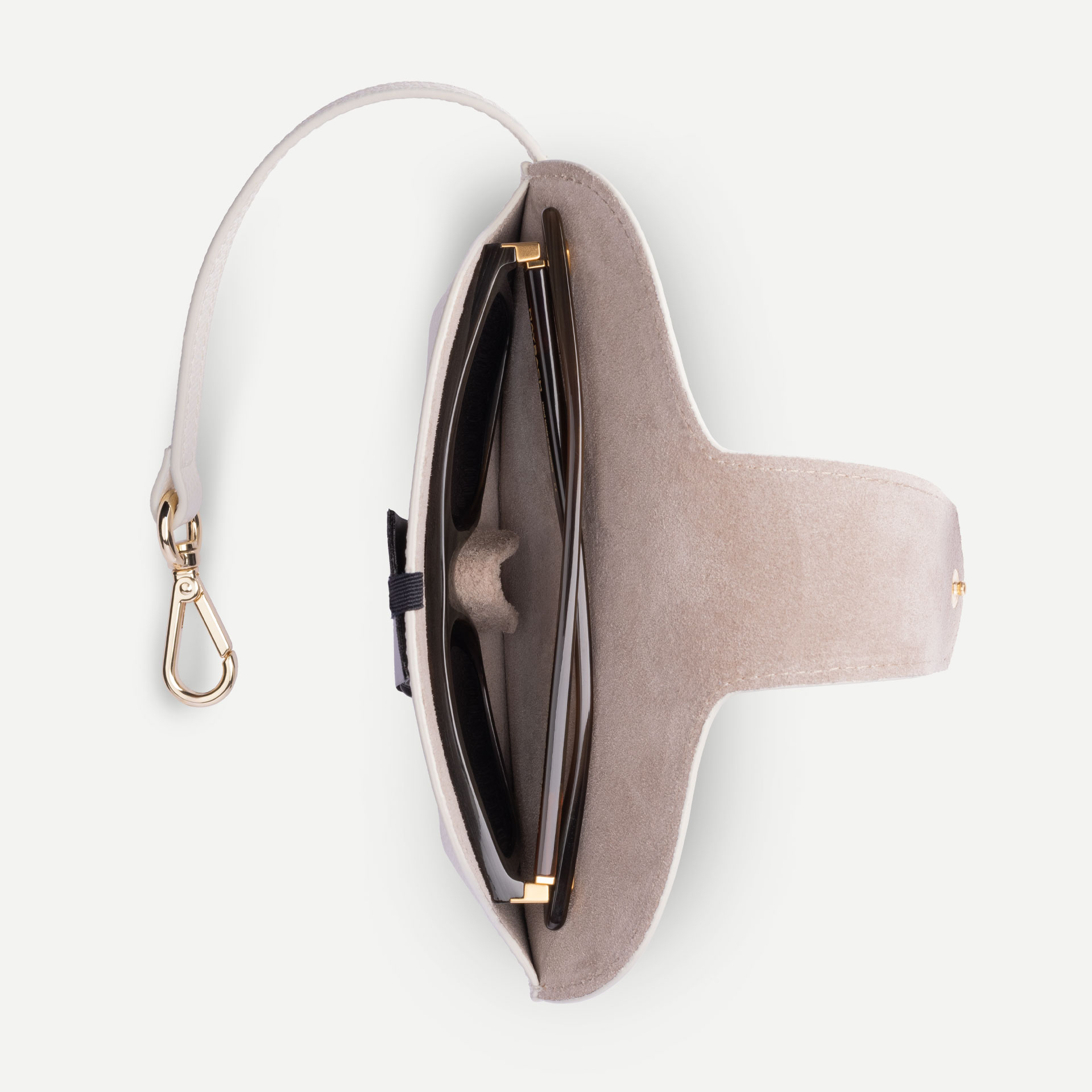 THE PERSPECTIVE I by MAYBACH elegantly unites luxury and functionality. Crafted from finely embossed calf leather with a soft suede lining, it offers premium protection for your eyewear. A silver or gold MAYBACH emblem, depending on the leather colour, highlights its exclusive appeal. With its leather strap and carabiner, the case can be easily attached to bags, backpacks or jackets – a refined companion for glasses and sunglasses on the go.